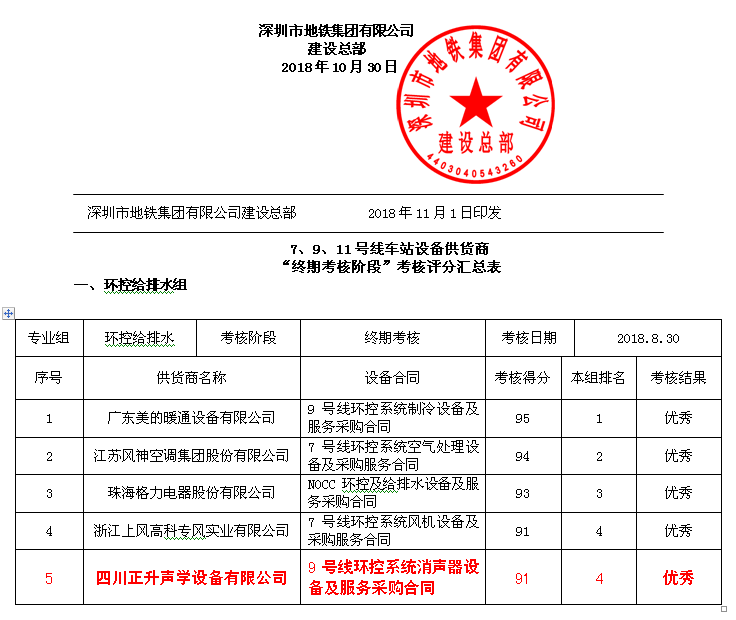 此次考核,是深圳市地鐵集團有限公司建設(shè)總部車站設(shè)備中心、合約法律中心、安全質(zhì)量中心等部門在2018年第三季度,對深圳地鐵7、9、11號線車站設(shè)備供貨商進行的終期階段考核及綜合評價考核,正升公司作為環(huán)控給排水組的24個合同設(shè)備供貨商之一,參與此次進行了考核工作,最終正升以總分91分、小組總排名第四的突出表現(xiàn),獲得終期階段考核“優(yōu)秀”評價。